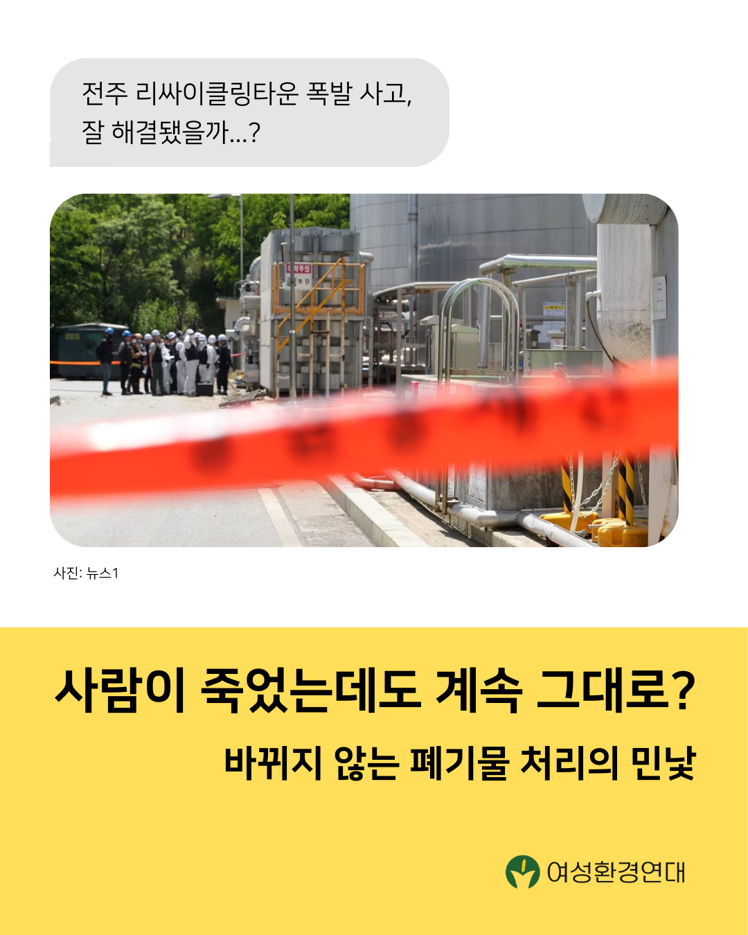 2024년 5월, 전주시의 생활 폐기물 처리 시설인 전주 종합리싸이클링타운에서 폭발이 발생해 노동자 5명이 중화상을 입은 사고를 기억하시나요? 전문가들은 이미 '예견'된 인재였음을 지적합니다. 심지어, 1년이 지난 오늘날까지 안전대책, 작업방식, 위험 설비, 피해자 유족 지원 중 어느 것 하나 달라진 것 없다는 현실이 충격적입니다.
