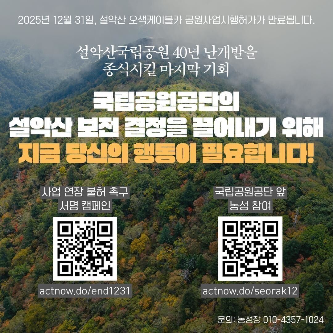 12월 31일, 설악산 오색케이블카 공원사업시 허가가 만료됩니다. 사업 허가가 연장되지 않으면, 국립공원 내 공사를 위한 모든 행위를 진행할 수 없어 사실상 취소 수순을 밟게 됩니다.