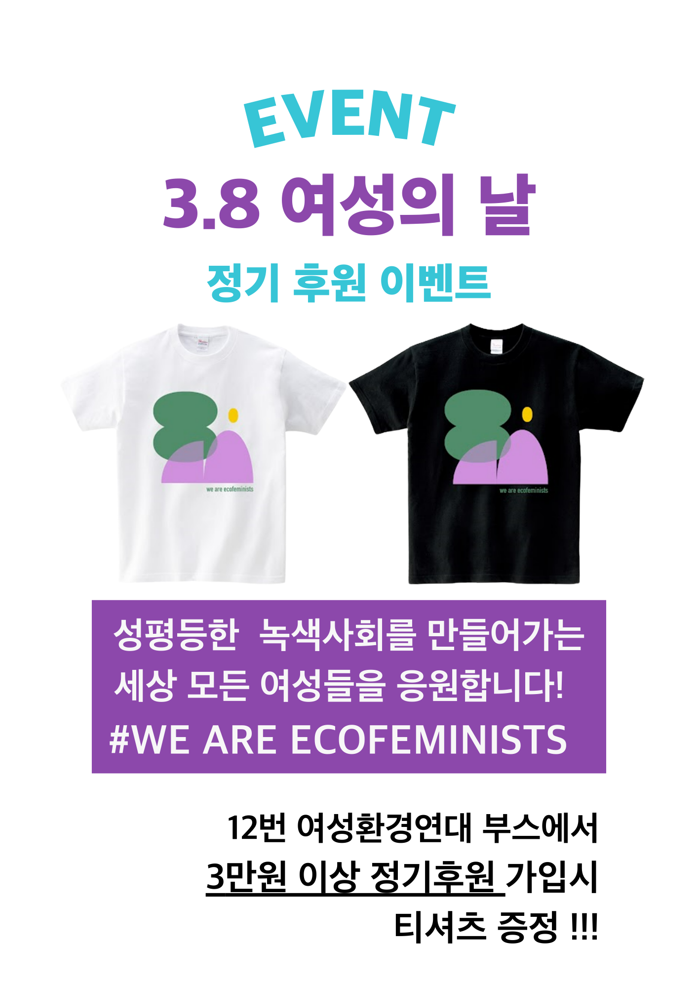 3월 7일 토요일, 광화문 서십자각 12번 여성환경연대 부스에서 3만원 이상 신규회원으로 가입해주신 분께는 #we are ecofeminists 티셔츠를 선물로 드립니다.